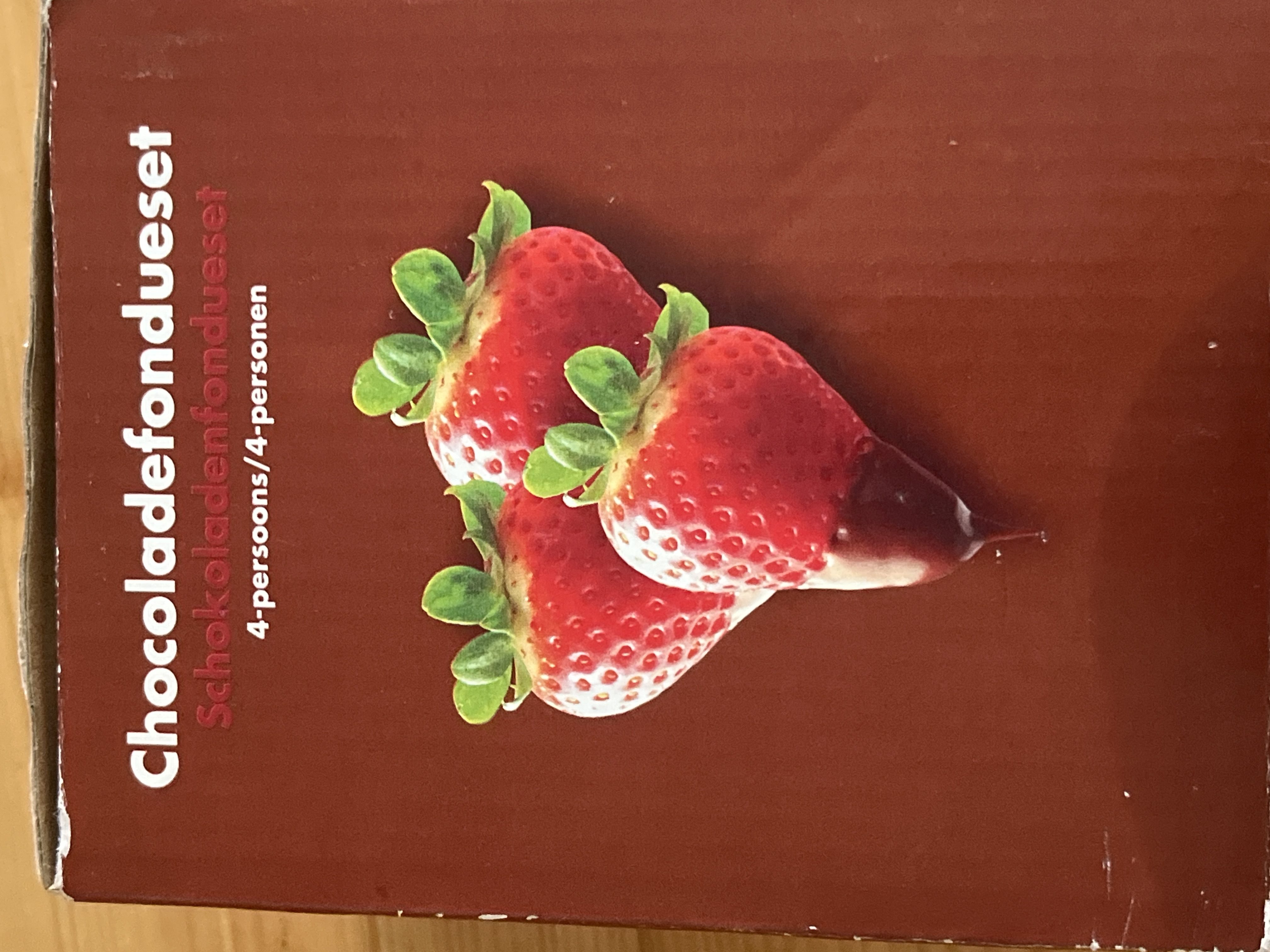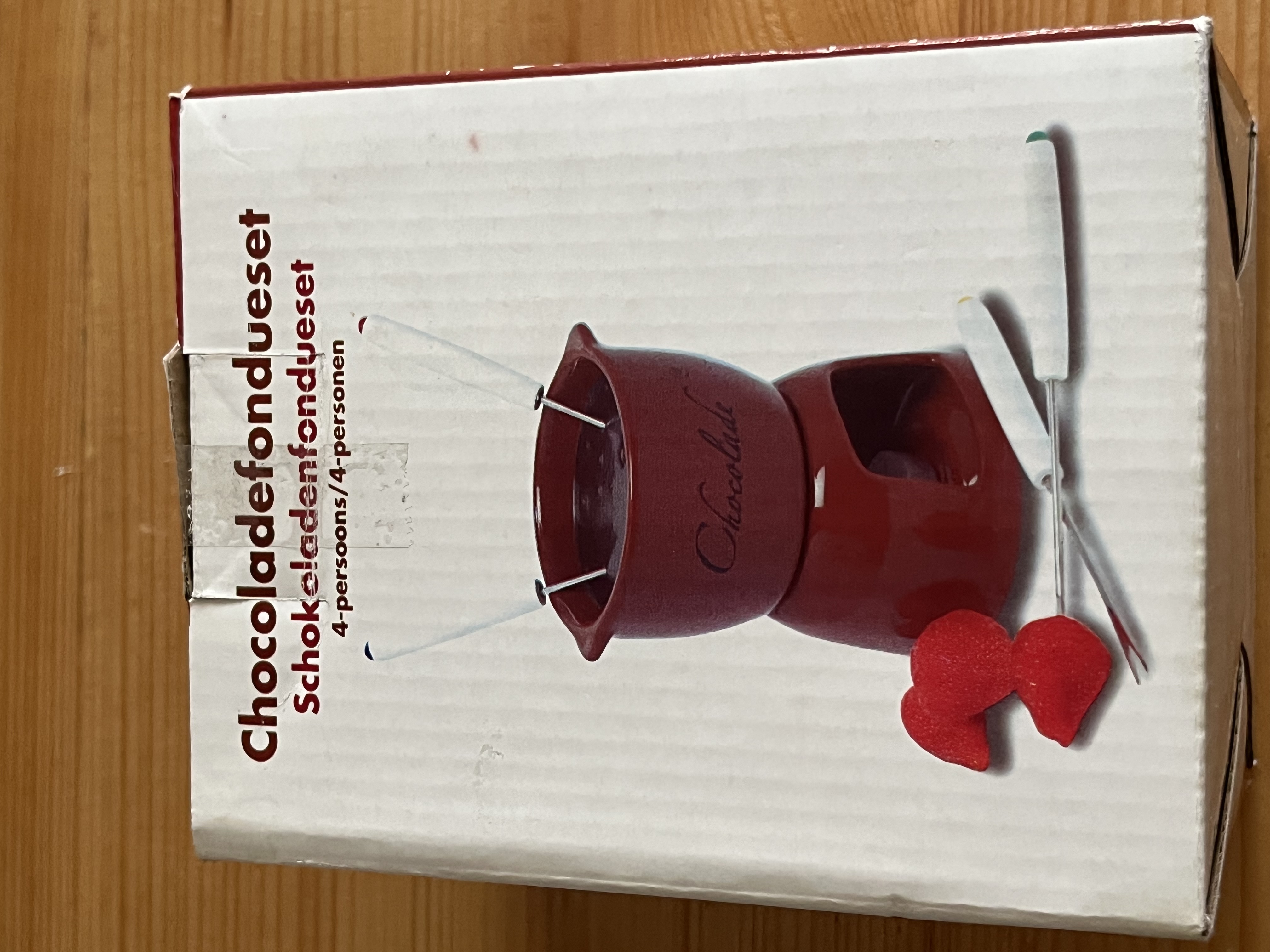 Chocoladefondueset voor 4 personen. Geschikt voor o.a fruit en marshmallows. Heerlijk dessert voor de feestdagen of kinderpartijtje; onzin om zelf aan te schaffen want wij hebben het al! Dus lenen maar 🤗