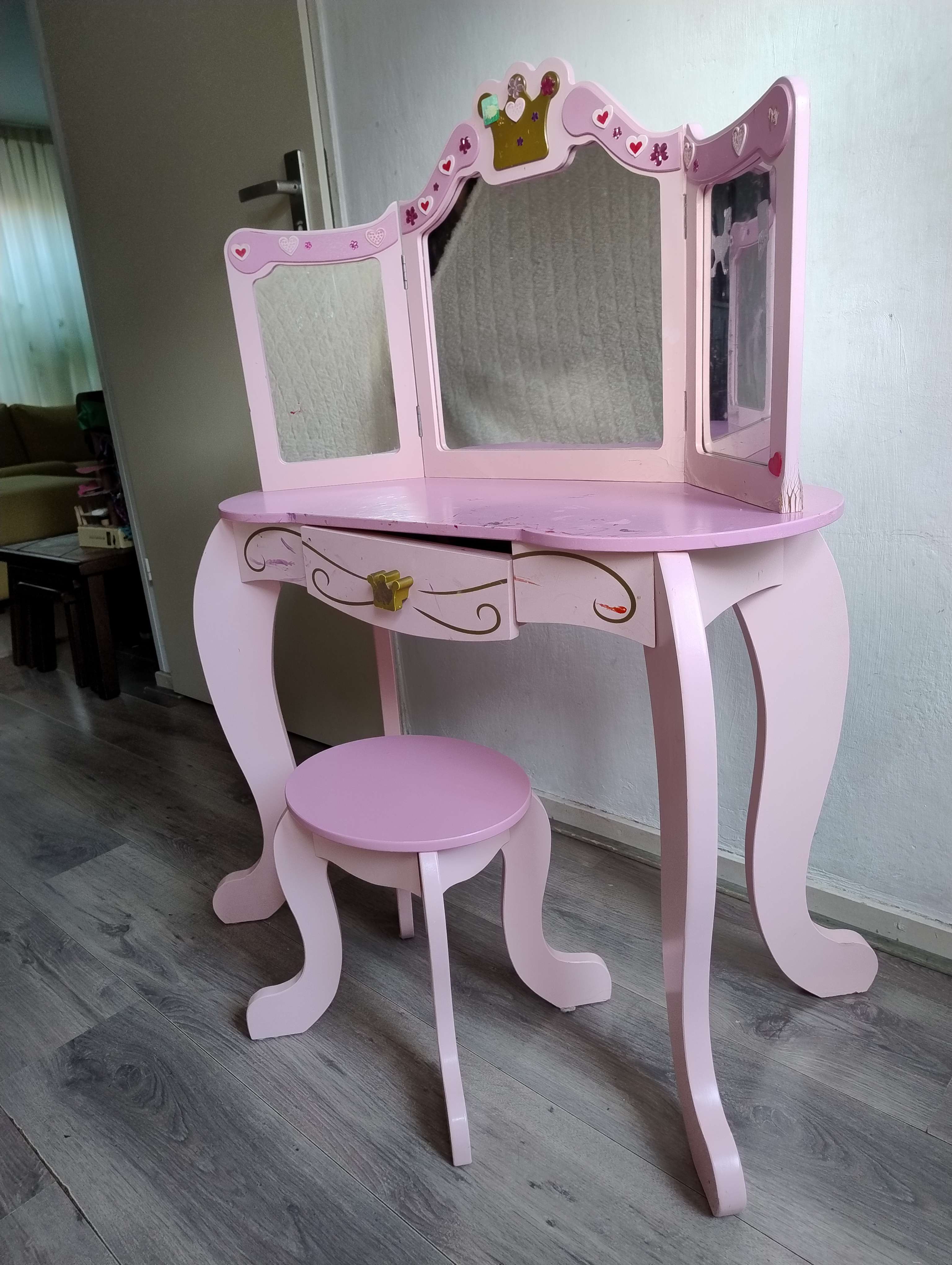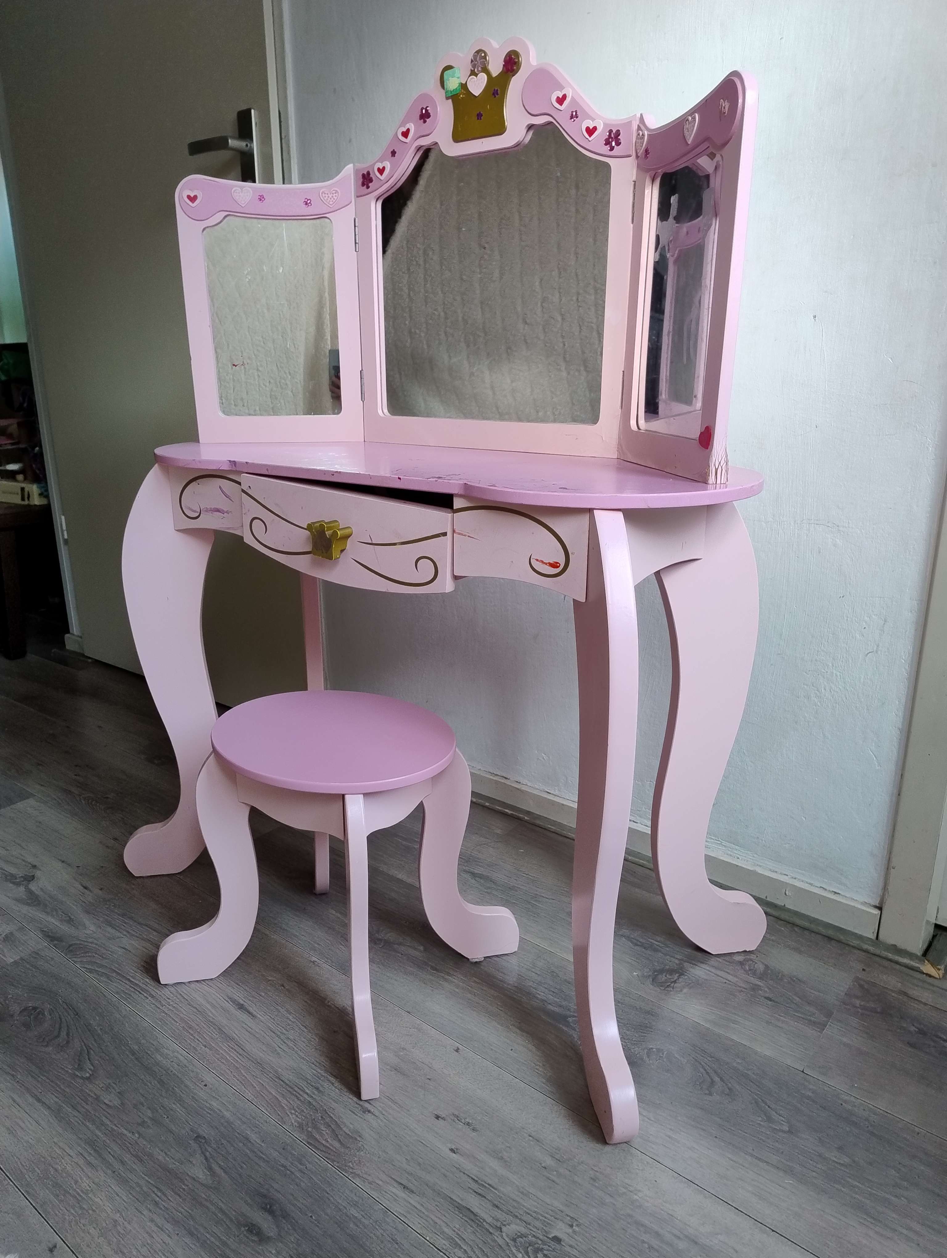 Kaptafel voor kinderen. Met zeer veel plezier gebruikt. Beetje waterschade door openstaand raam en lade heeft reparatie nodig. Nog erg leuk en klaar voor een volgende ronde speelplezier. GRATIS AF TE HALEN